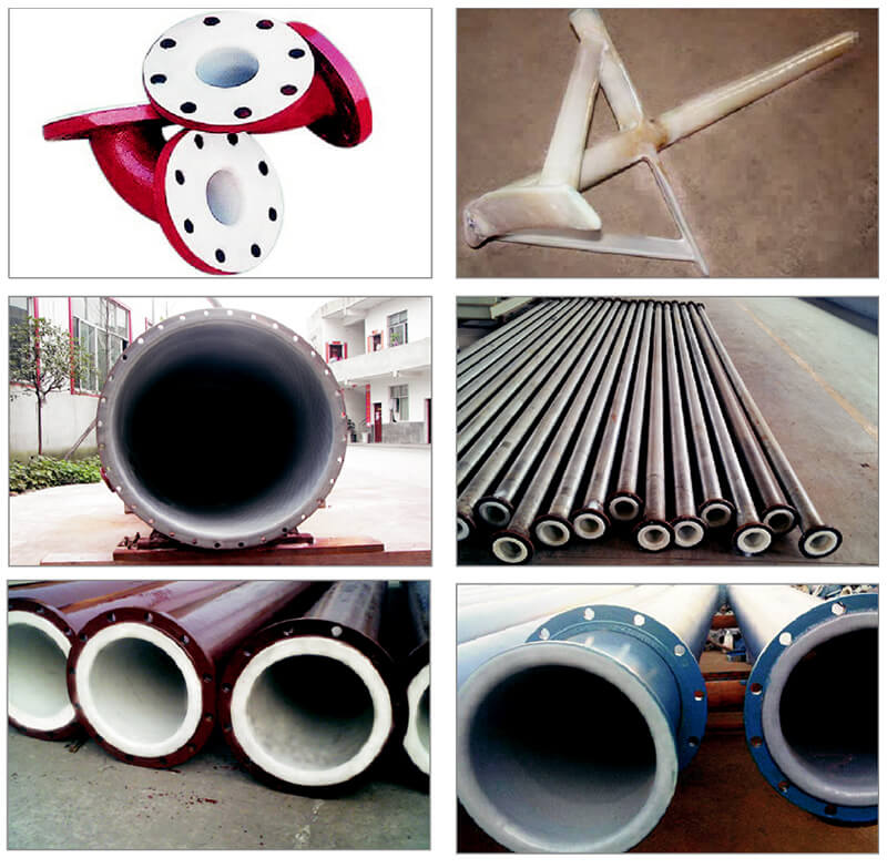 公司PE(PO)襯里采用的原材料是進口粉末狀的線性低密度聚乙烯(LLDPE),它的加工方法為旋轉成型,工件(鋼制容器或管道)在旋轉的過程中加熱,粉狀樹脂的工作表面吸熱熔融,旋轉一次便粘上一層粉狀樹脂,隨即吸熱融化,最后加工至規(guī)格厚度后冷卻成型,所以它在工藝上保證了襯層無針孔、無泄漏、無任何焊縫。并且該工藝對工件的內外結構無要求,無論結構如何復雜,均能加工成型。在工件較大,運輸有困難的情況下還可以現(xiàn)場施工,使用溫度在100℃以內,在酸、堿、鹽等強腐蝕介質中能長期穩(wěn)定使用,廣泛用于冶金、化工、制藥、食品、環(huán)保、能源等行業(yè)中接觸腐蝕介質的管道、槽、罐、塔、風機、交換器、攪拌槳、閥門等。